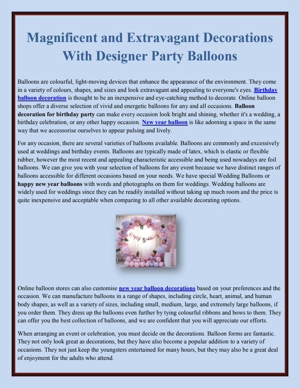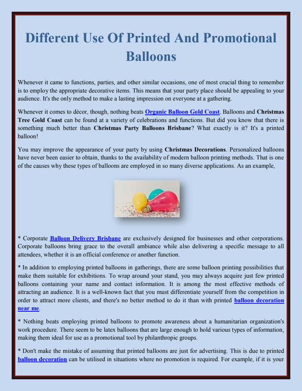 Using the services of competent service providers is essential for achieving high-quality balloon printing and Christmas Tree Gold Coast. They have the ability to produce spectacular graphics and messages that draw people to a party. There are numerous online professional organisations that deal in balloon printing and can create eye-catching printed balloons for any event.Weddings are a time to celebrate with family, friends, and relations. Because a wedding is a once-in-a-lifetime event, decoration is crucial. Colors of Organic Balloon Gold Coast are a very unique and attractive way to adorn your wedding location. Don't be taken aback! Balloons aren't just for birthdays. In fact, they may improve the splendor of any occasion by showering it with love, warmth, and happiness.However, if you are considering an island wedding, a mixture of flowers as well as balloons might be great. You can create a combination of balloons in various designs, such as a heart-shaped pattern with the bride and groom's names inscribed on it, or a boat-shaped arch to give your wedding location a classy and trendy appeal. Given the seaside backdrop, a combo of red & cream balloons would look nice.If you like lighter colours, consider using white color balloons with blue ribbons affixed to them. This combination would undoubtedly complement the magnificent greenish-blue water and won't even irritate the eyes. Another possibility would be to have a white-themed wedding. From the bride's gown to the white draperies loaded with soft seats for the visitors, to the white flowers. Article Source : https://www.articleaffiliate.com/spice-up-your-party-or-event-with-printed-balloons/Balloons are colourful, light-moving devices that enhance the appearance of the environment. They come in a variety of colours, shapes, and sizes and look extravagant and appealing to everyone's eyes. Birthday balloon decoration is thought to be an inexpensive and eye-catching method to decorate. Online balloon shops offer a diverse selection of vivid and energetic balloons for any and all occasions. Balloon decoration for birthday party can make every occasion look bright and shining, whether it's a wedding, a birthday celebration, or any other happy occasion. New year balloon is like adorning a space in the same way that we accessorise ourselves to appear pulsing and lively.