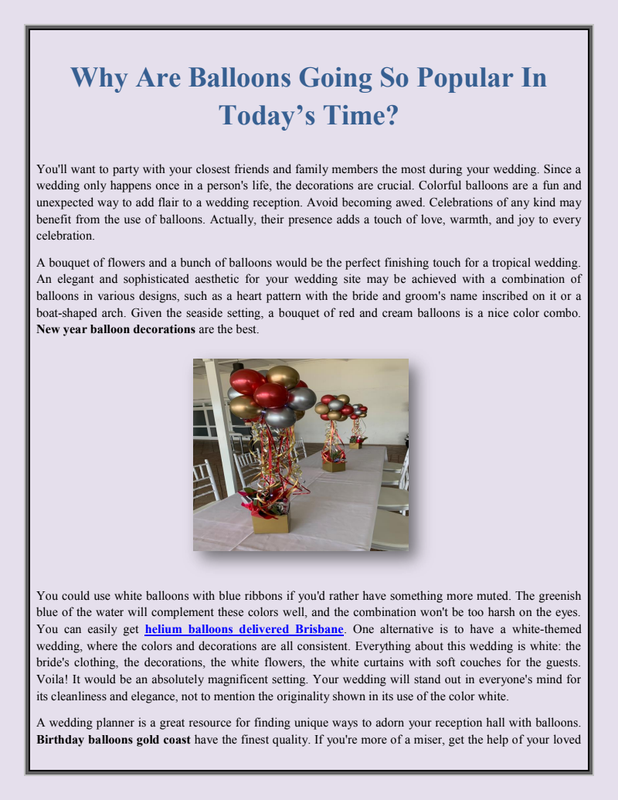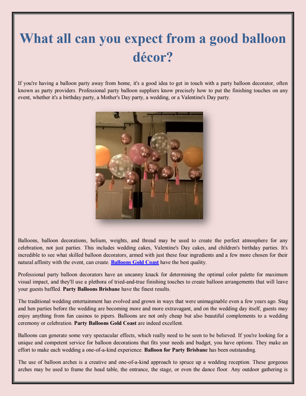 Balloons, balloon decorations, helium, weights, and thread may be used to create the perfect atmosphere for any celebration, not just parties. This includes wedding cakes, Valentine's Day cakes, and children's birthday parties. It's incredible to see what skilled balloon decorators, armed with just these four ingredients and a few more chosen for their natural affinity with the event, can create. Balloons Gold Coast have the best quality.