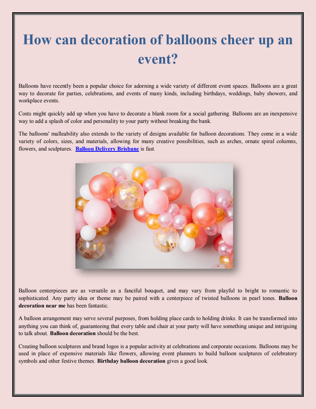 The balloons' malleability also extends to the variety of designs available for balloon decorations. They come in a wide variety of colors, sizes, and materials, allowing for many creative possibilities, such as arches, ornate spiral columns, flowers, and sculptures. Balloon Delivery Brisbane is fast.