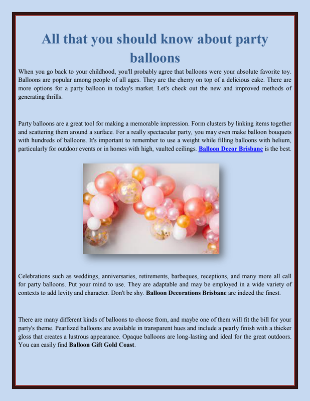 There are many different kinds of balloons to choose from, and maybe one of them will fit the bill for your party's theme. Pearlized balloons are available in transparent hues and include a pearly finish with a thicker gloss that creates a lustrous appearance. Opaque balloons are long-lasting and ideal for the great outdoors. You can easily find Balloon Gift Gold Coast.